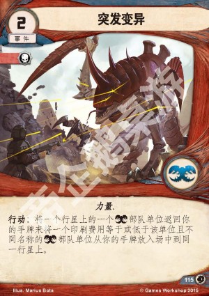文本行动:将一个行星上的一个泰伦虫族部队单位返回你的手牌来将一个印刷费用等于或低于该单位且不同名称的泰伦虫族部队单位从你的手牌放入场中到同一行星上。